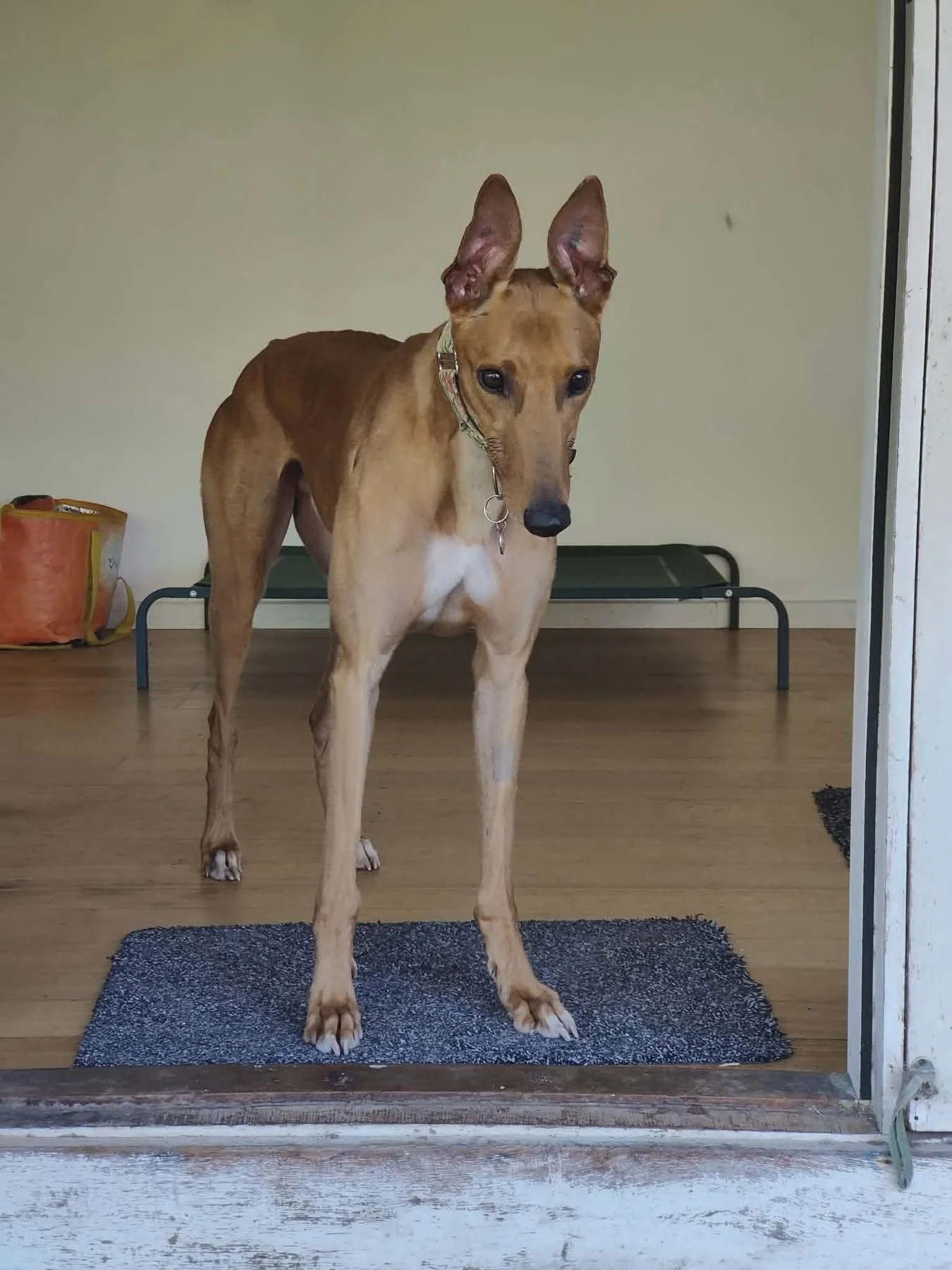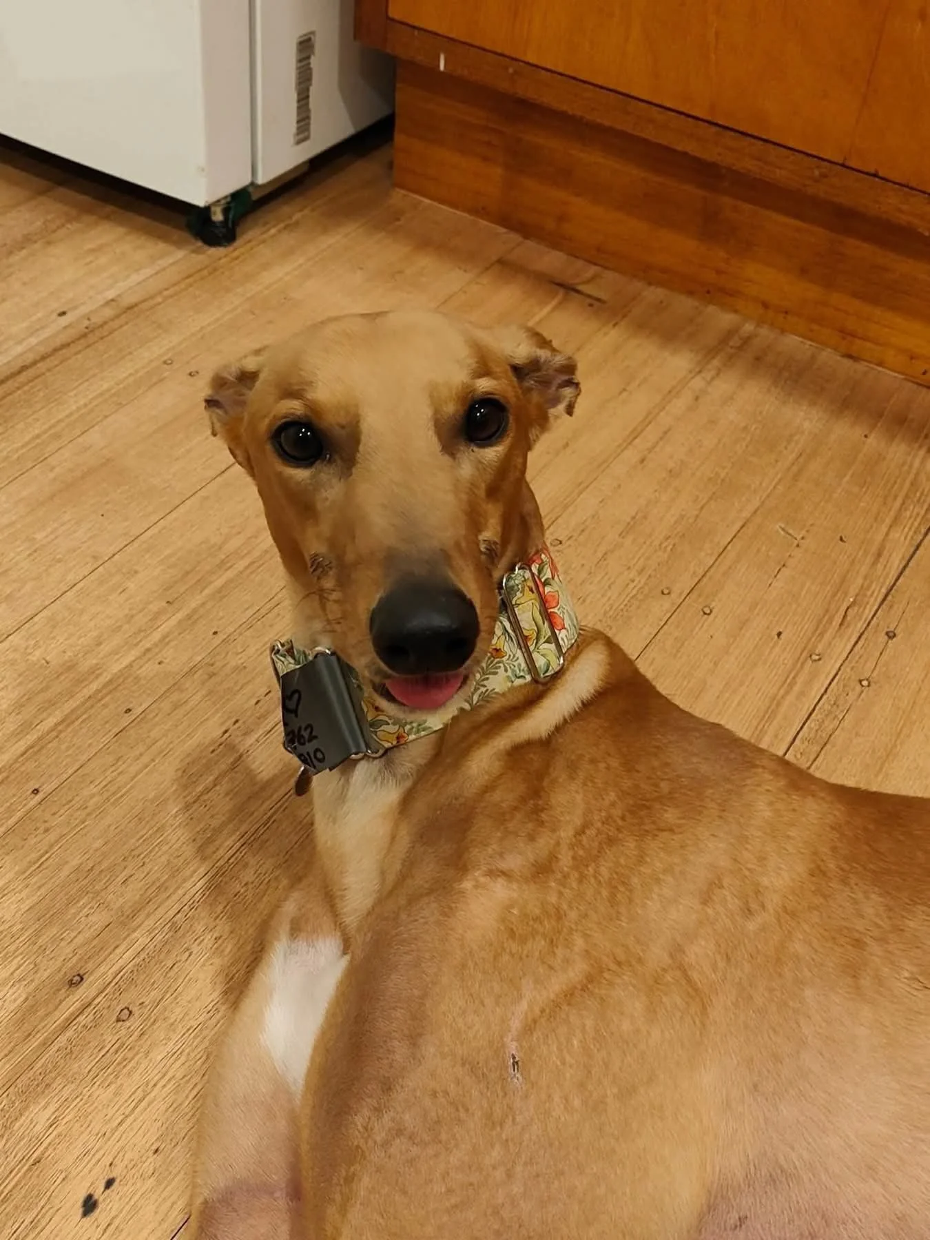 Meet Scotch Finger, a 3-year-old Greyhound with a big heart, long legs, and an even longer love for people. This handsome boy is affectionate, social, and happiest when he’s getting pats from anyone willing to give them. Neighbours, visitors, delivery drivers — everyone is a friend in Scotch Finger’s world.